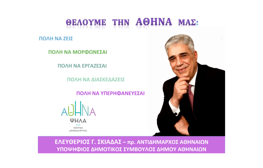 Στην βελτίωση της καθημερινότητας του Αθηναίου πολίτη εστιάζει ο συνδυασμός «Αθήνα Ψηλά» του Κώστα Μπακογιάννη, δήλωσε ο Ελ. Σκιαδάς, σε ραδιοφωνική συνέντευξη που έδωσε, με την ιδιότητα του υποψήφιου δημοτικού συμβούλου στις δημοτικές εκλογές 2019 της Αθήνας, στην εκπομπή «Ακραίως» με τον Τάκη Χατζή στον «ΣΚΑΪ 100,3».
